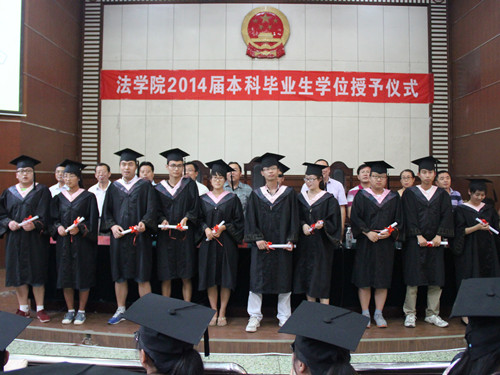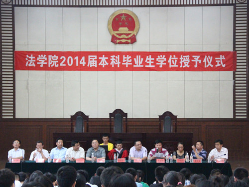 6月27日上午,我院2014届毕业生学士学位授予仪式在模拟法庭举行。我院党总支书记刘昕、院长杨晓春、党总支副书记王仲孝、副院长朱伯玉、李哲以及学院教师代表、2014届全体毕业生参加此次学位授予仪式。仪式由王仲孝主持。