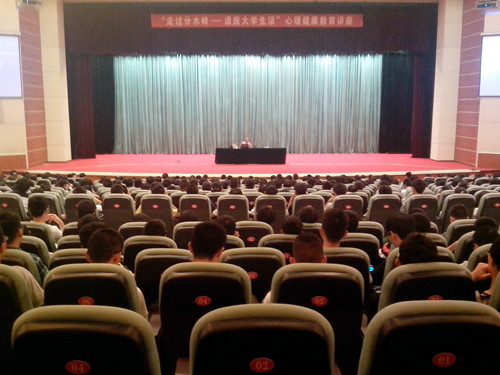 为更好的帮助新生适应大学生活,9月20日下午,我校于大学生艺术中心开展“走过分水岭”讲座,此次讲座的主讲嘉宾是我校著名心理咨询师腾亮,我院、建筑工程学院全体新生参加此次讲座。