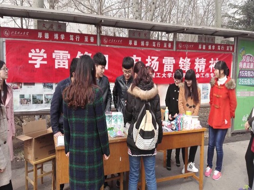 早上,15级全体学生前往敬老院陪老人聊天,为老人表演节目,听老人讲述他们的艰辛岁月,并在工作人员的指导下为敬老院打扫卫生。14级学生在校内开展一系列志愿活动:爱心商品销售为持有绿卡的同学提供福利;帮助宿舍管理人员打扫宿舍楼,减轻他们的负担;与图书馆工作人员共同整理图书,使同学们提供更加便利的翻阅图书;扶起校园内歪倒的自行车等,同学们以实际行动表达传承雷锋精神,担当社会责任。