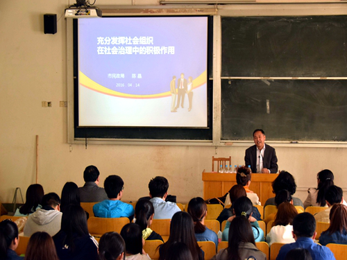 报告会上,陈晶结合个人成长经历及经验,为同学们介绍当今社会求职需注意的问题。他以公务员求职为例,为同学们讲述简历制作的注意事项。此外,他也从一些学生关注的问题入手,深入浅出地教导同学们要敢于面对挫折,在生活中要树立信心、做好准备、保持激情。陈晶围绕着“社会组织、社会组织作用、存在问题、思考及建议”四方面展开报告。他说,十八大以来,政府越来越重视社会组织发展,未来社会组织发展任重道远,要坚持健全完善法律制度和体系、强化监管和服务,才能够使社会组织健康快速发展。
