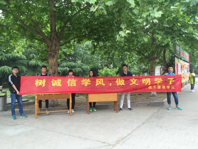 活动最后,所有工作人员与部分参加人员一起宣誓——树诚信学风,做文明学子。随着百人签名活动在校园的举行,使廉洁诚信深入同学心中,为和谐校园建设做了思想上准备。