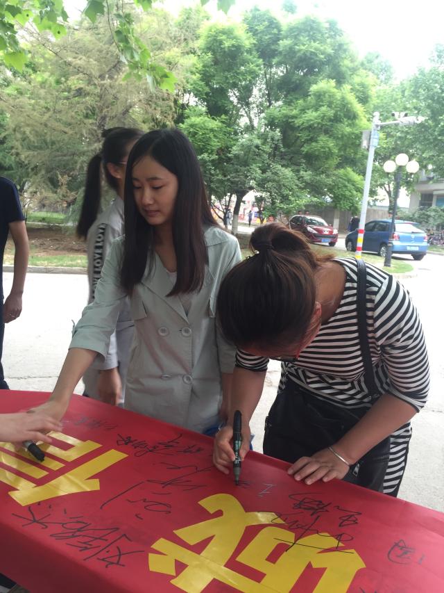 活动开始后,不少同学主动前来参加活动,在印有“树诚信学风,做文明学子”的长达7米的条幅上签下自己的名字,并细心聆听工作人员对于廉政知识的讲解。活动现场气氛火热,不仅吸引了本校同学的参与,更是引起了来我校参加比赛的外校同学的注意,青岛大学、滨州医学院等学校的同学也纷纷驻足,积极参与到此次活动中。