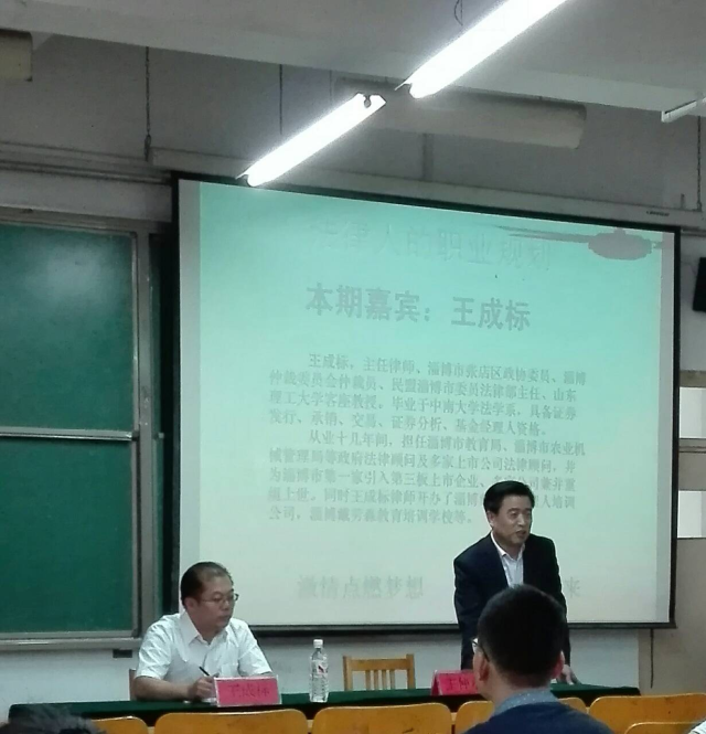 激情点燃梦想,创业成就未来。5月12日下午,由校团委主办、WilliamHILL中国承办的WilliamHILL中国大学生创业论坛在我校西校区2号教学楼201号教室举行。此次讲座由山东远信律师事务所律师王成标主讲,我院党总支副书记王仲孝主持。