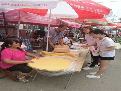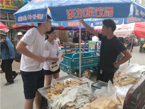 继续在集市上进行问卷调查。实践团成员来到食品区,正好遇到一个年轻人在卖自己家制作的绿豆饼,通过交流得知摊主是湖北某大学的一名大三学生,开学即将大四,自己利用假期时间帮助父母卖点东西补贴家用,这种精神领实践团成员甚是佩服。