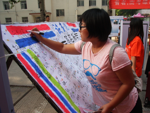 新生们满怀憧憬,积极在签名板上签下自己的名字,许下自己对大学的愿望,拍照留念。