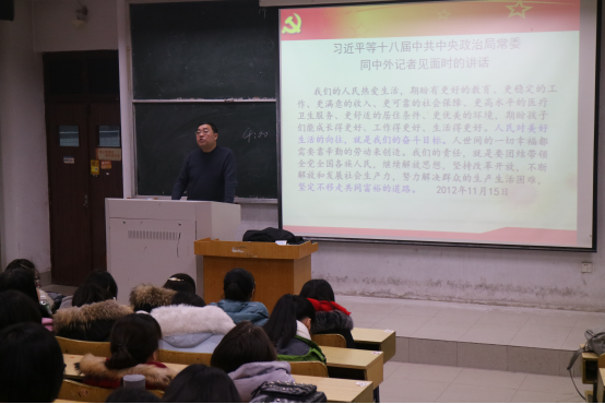 刘昕书记先是从自己的大学生活说起,剖析自己当时的心路历程,引发了同学们的共鸣,会议气氛热烈,同学们不禁凝神等待刘昕书记接下来的讲话。接下来刘昕先是介绍坚持马克思主义的重要性,从多方面分析共产主义信仰和宗教信仰的不同,并提醒同学们学生不能在校园里宣传宗教,令同学们感受到刘书记的拳拳爱护之心。之后,刘昕着重介绍了党的“四个全面”的工作目标和“五大发展理念”,使同学们贴近党的工作思想,能够对我国当前发展形势有更深入清晰的了解。另外刘昕书记推荐了一些阅读书目,进一步满足同学们了解共产党的诉求。会议最后,刘昕书记希望同学们珍惜大学生活,努力学习,全面提高自身素质,了解党,拥护党,并积极为入党做准备。