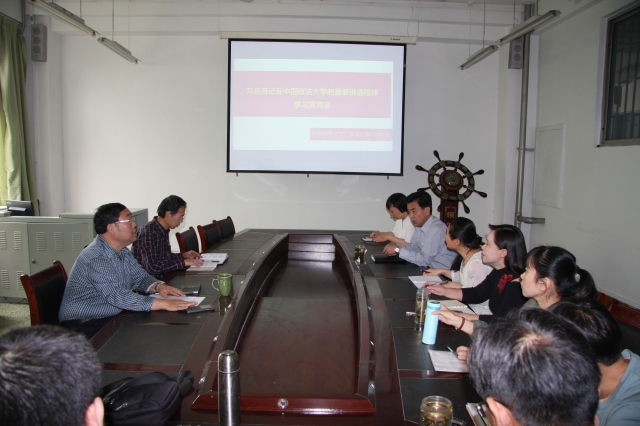 大家首先观看了53日《新闻联播》有关习近平考察中国政法大学的新闻视频,然后刘昕同志带领大家学习了习近平总书记重要讲话的内容并做了解读,他强调指出:习总书记在五四青年节前到中国政法大学考察,不仅是对中国政法大学的肯定,也是对全国政法类院校、政法类人才培养基地的极大鼓舞,是对依法治国方略实施的巨大鼓舞。习总书记重要讲话对法治人才培养和法治人才队伍建设、法学理论研究和法学教育教学、法律学科建设等方面都提出了明确要求,为我院法学教育事业的发展和法治人才培养指明了方向。我们要以习总书记讲话精神为指导,认真谋划人才培养和法学学科发展工作,从以下六个方面学习贯彻落实习总书记讲话精神:一是“两学一做”学习教育紧密结合起来,进一步推动落实“两学一做”学习教育常态化制度化;二是在教学方面不断提高和改进教学方法,深入研究和解决好为谁教、教什么、教给谁、怎样教的问题;三是在科研方面坚持以马克思主义法学思想和中国特色社会主义法治理论为指导,尽快出一批科研成果;四是在理论与实践的关系方面,打破体制壁垒加强法学研究工作者和法治实际工作者之间的交流,加强法律诊所教学、优化学生实践;五是在学生教育管理方面,对学生的人生观、价值观做好教育引导,引导学生立德树人,德法兼修;六是强调党建工作和思想政治工作要紧密结合,要虚功实做,把解决师生思想问题与教学、科研、学习、就业紧密结合起来,为我国依法治国战略的实施和法治人才的培养、法学学科的发展做出更大的贡献。