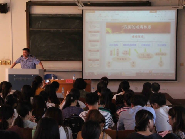 报告伊始,邵广林介绍了目前淄博市吸毒人员情况以及戒毒部门所取得的工作成绩。接着,他从毒品的概念讲起,跟同学们举例常见的毒品:冰毒、海洛因等,从而延伸到毒品的危害等方面。他生动形象地向学生们展示了毒品对人体、家庭、社会的多重危害,并结合我国《刑法》对毒品犯罪的规定作详细的讲解。他指出:许多人因为各种各样的原因沾染了毒品,不仅自身的身体、精神受到巨大损害,对自己家庭也造成了伤害,导致妻离子散,甚至家破人亡,对社会更是造成不良影响,甚至威胁了社会秩序。接着,邵广林分析了全球毒品形势并且介绍了我国的戒毒体系,着重突出了对吸毒人员的矫正这部分。他讲到,目前大部分人对于毒品都存在着错误认识,想做好矫正首先就要让他们认清毒品的危害。同时,对于吸毒人员的矫正方法,是针对吸毒人员既是违法者、病人、又是受害者的三个特性,分析了对吸毒人员进行矫正的难度,经过分类实测,决定运用山东戒毒“三六三”模式,通过分期、六疗、分平台步骤去进行矫治。最后,邵广林分析了如今社区矫正存在的问题,如社区功能不完善、社区主体意识不强等,他希望通过社区帮扶等形式逐步解决这些问题。