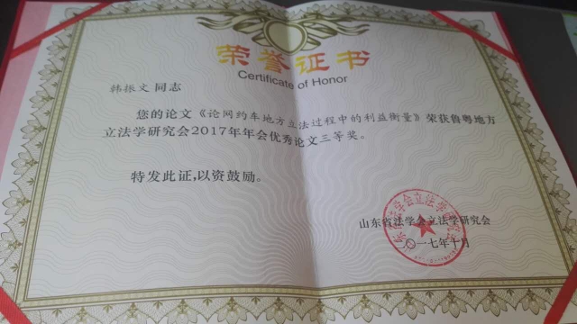 我院韩振文老师应邀参加会议,做了“论网约车地方立法过程中的利益衡量”的主题发言,提交的会议论文荣获优秀论文三等奖,充分展示了我院的科研实力与学术水平。