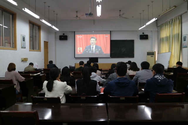 10月18日上午9:00,举世瞩目的中国共产党第十九次全国代表大会在北京正式开幕,我院党总支高度重视十九大开幕式的收听收看工作,专门下发通知组织师生认真收看。学院理论学习中心组成员和学生党员在二号教学楼323教室集体收看盛况直播,其他党员教师根据实际情况进行收听收看,认真学习十九大报告。