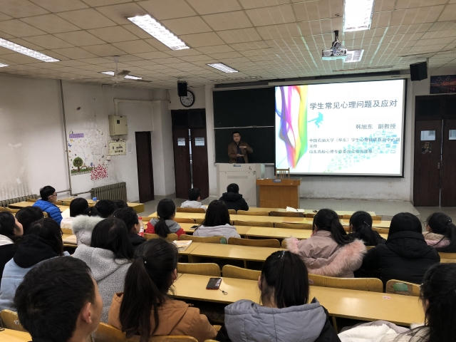 12月21日下午四时,中国石油大学(华东)学生心理健康教育中心副主任、山东高校心理专业委员会常务理事韩旭东副教授应邀到我院开展“大学生常见心理问题及应对”的主题讲座。全体2017级班长、团支书、心理委员及宿舍长聆听了此次讲座。讲座由辅导员孟晶晶主持。