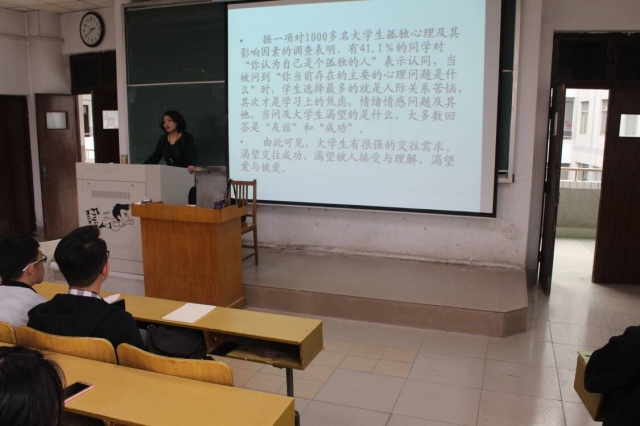 刘海鹰以她所做的心理咨询实践为基础,深入浅出地向同学们讲解人际交往的相关内容。首先,她引用经典寓言小故事深刻地阐释了“人为什么要与他人交际”的问题,这为座谈会话题的深入展开奠定了基础。刘海鹰还通过一系列数据信息向同学们表明人际交往的重要性。紧接着她罗列出各种经典案例,分别从人际交往的定义、特点及过程三方面解释人际交往。为更好地调动同学们的积极性,拉进与同学们的距离,刘海鹰带领同学们做一些心理游戏,以提高同学们的心理素质,为同学们的人际交往提供更多认知,并讲解了进行人际交往的五大原则与几种错误心理,为每位大学生敲响了人际交往的警钟。