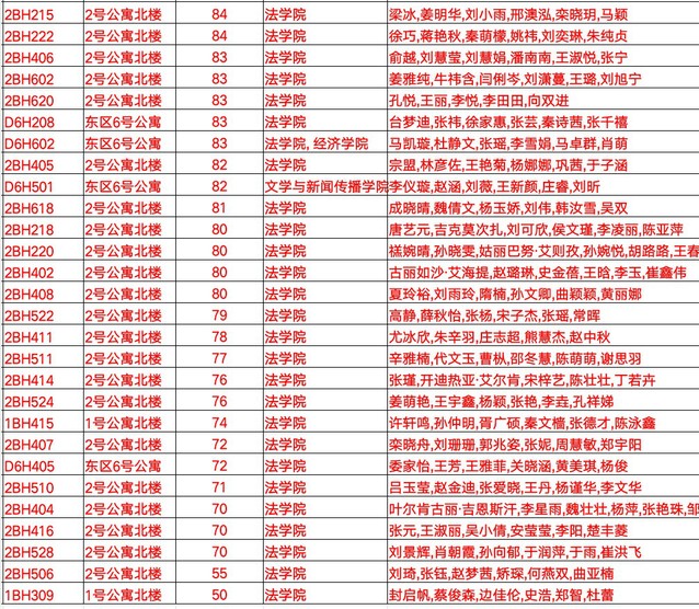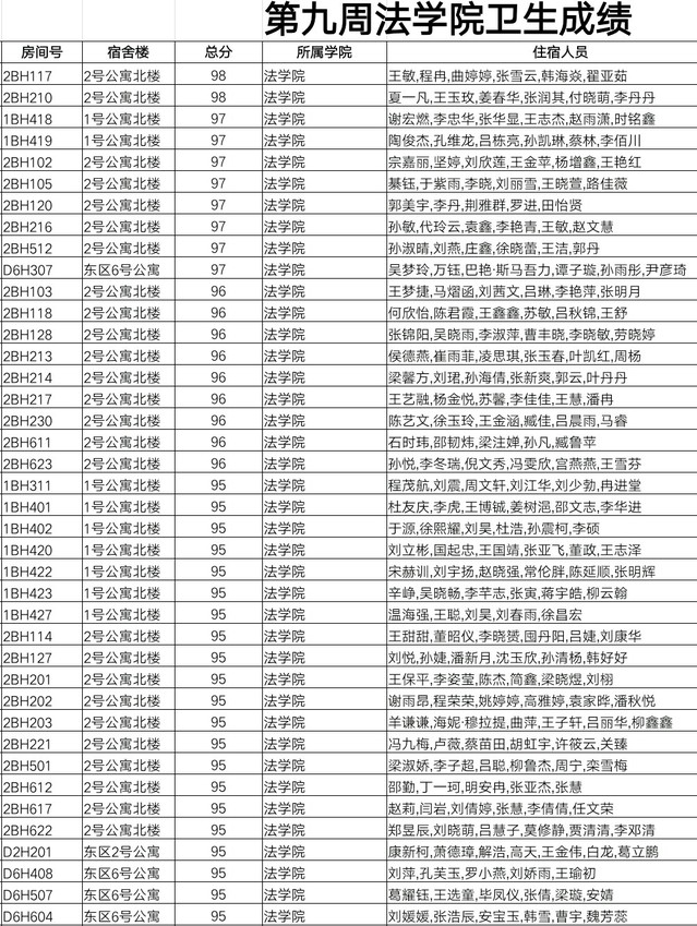 为进一步提高同学们的宿舍卫生意识,并能督促大家养成良好的生活习惯,同时创建一个健康、和谐、文明的宿舍环境,使每位同学都能在舒适的环境中生活和学习,学院对学生宿舍第九周卫生成绩进行汇总,现通报如下: