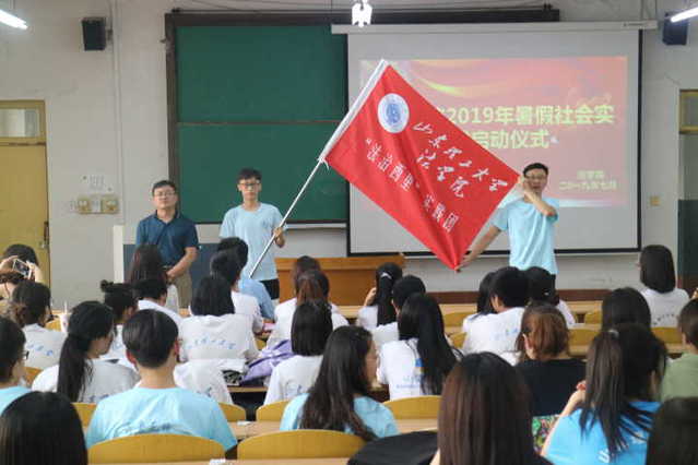接着,由社会实践代表同学带领全体人员进行宣誓,表达了将会以实际行动做好此次实践工作的决心。由张宗磊代表学院为学生代表授旗,鼓舞了全体实践团队切实开展好此次实践活动的信心。最后,全体师生合影留念。