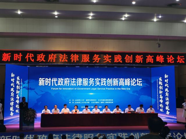 9月8日,由我校与淄博市律师协会、北京市盈科律师事务所联合举办的“新时代政府法律服务实践创新高峰论坛”在三号楼报告厅召开。校长张铁柱,山东省法学会专职副会长兼秘书长任伟、淄博市委常委、政法委书记韩国祥、淄博市司法局局长张志超、淄博市人民检察院副检察长万华、淄博市仲裁办党组书记徐俊国、淄博市司法局副局长,市律师行业党委书记刘长军、淄博市中级人民法院国家赔偿办主任房鹏、淄博市律师协会会长徐文业等领导嘉宾出席本次论坛。来自北京、上海、济南、青岛等省内外的高校专家学者和法律实务部门代表以及我校社科处、WilliamHILL中国负责人参加会议。