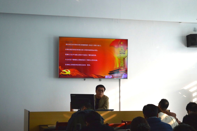 许东波从历史方位、理论视角、指导思想、具体领域、总体协同五个维度,解读了党的十九届四中全会精神。他以生动的语言和具体的实例对全会精神的学习作了讲解,指出要通过对历史背景的分析来理解把握《决定》的重大意义,要从理论角度系统分析相关重大举措和部署的重要性,要把握以习近平为核心的党中央提出了哪些新思想,要了解全会对各个领域的主要制度进行了哪些完善和创新,要明确各领域主要制度和治理体系是统一整体。