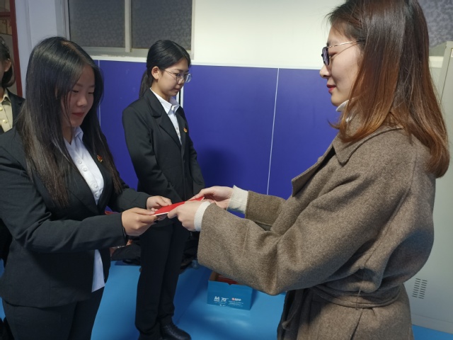 仪式在全体党员庄严齐唱《国际歌》中开始,新党员在领誓人魏晨晨老师的领誓下,面向党旗举右手握拳庄严宣誓。宣誓后,入党介绍人代表为新党员佩戴党徽、分发党章。