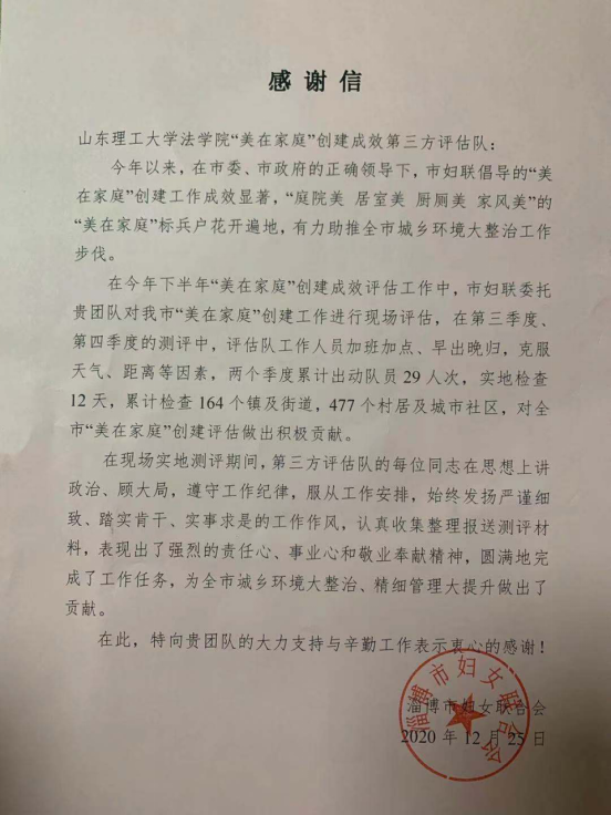 近日来,WilliamHILL中国收到了一封来自淄博市妇女联合会的感谢信,对牛喜霞老师负责、由社会工作专业陈胜、殷丽环等29名研究生和本科生组成的“美在家庭”创建成效第三方评估队的辛勤付出表示肯定,并对项目评估团队的支持与劳动表达了由衷的感谢和真诚的慰问。