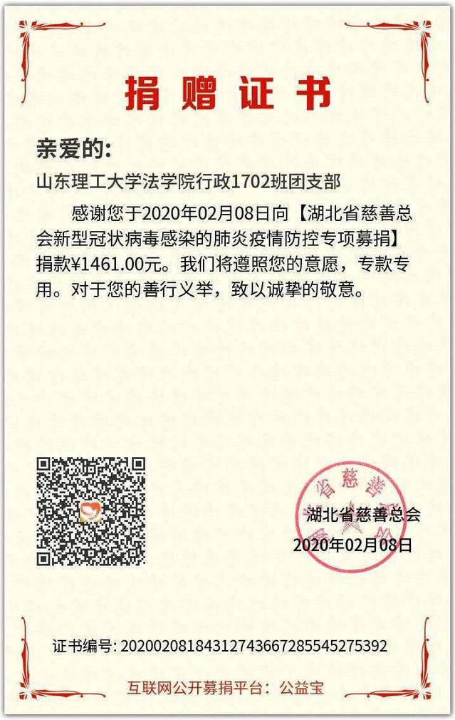 面对疫情防控的严峻形势,行政1702班班长圣金龙率先与本班委团支部进行商量,在得到全体班干部的一致同意后,在班级群里发起自愿募捐的倡议。辅导员孟晶晶老师在得知同学们集体募捐的消息之后,深受感动,也积极加入到募捐活动中。短短几个小时,便募集捐款1461元。根据同学们的意愿,将募捐所得钱款通过湖北慈善总会捐赠给湖北省疫情防控一线的医院。