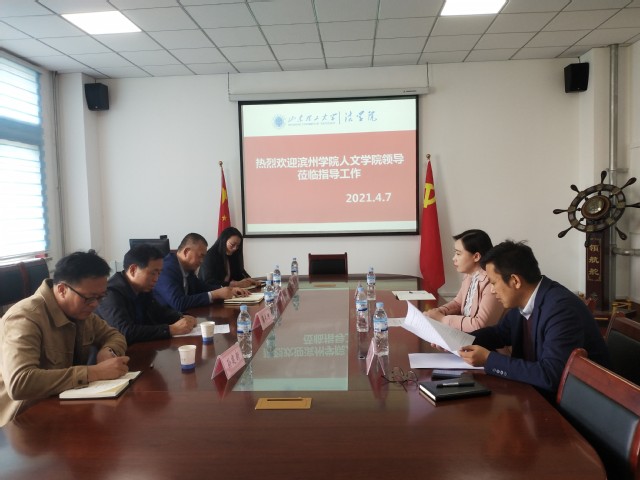 2021年4月7日,滨州学院人文学院党总支书记薛长河、党总支副书记韩安庄、孙建新及张荣一行到访我院。王玲院长、白洋副院长、法律系贾晓燕副教授参加了座谈交流。