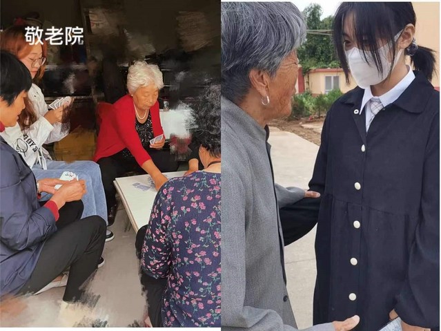 宋婕、李昕乐等同学走进当地敬老院,与老人们交流聊天,询问他们的生活起居情况,了解他们的内心世界,让老人感受到亲人般的关怀和温暖,大家有说有笑,气氛和谐,欢声笑语,暖意融融。
