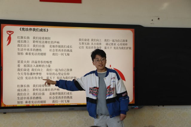 在讲座的最后,宣讲团成员亓鸿儒带领大家一起学唱《宪法伴我们成长》。