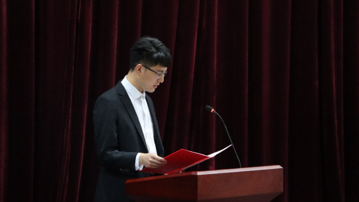 获奖学生代表张晓鹏上台发言,他表达了对设立奖学金的杜宝川先生以及学院的各位领导、老师的谢意,并表示今后一定会以更加努力地学习状态来回报所获奖励。
