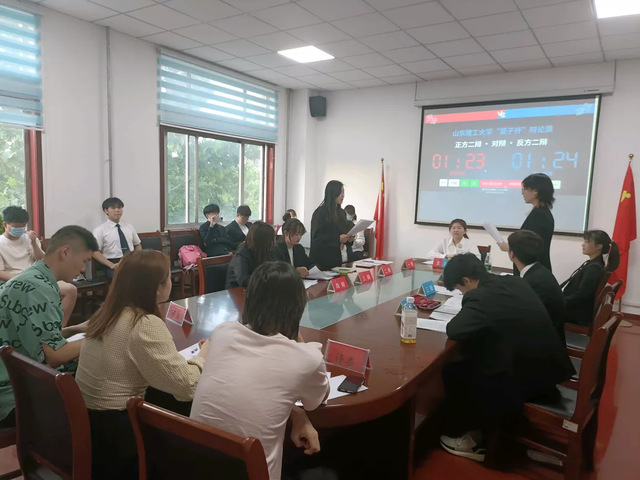 决赛在资源与环境工程学院与生命医药学院之间展开,双方围绕“当今社会应该提倡干一行爱一行还是爱一行干一行”展开激烈辩论。双方一辩队员开篇陈词,开门见山地阐明观点,引经据典,博征旁引地论证己方观点。自由辩论环节,整场比赛达到了高潮,双方唇枪舌剑,不甘示弱。正方妙语连珠,思维敏捷展开攻势;反方镇定应对,不卑不亢,寻找反击机会。