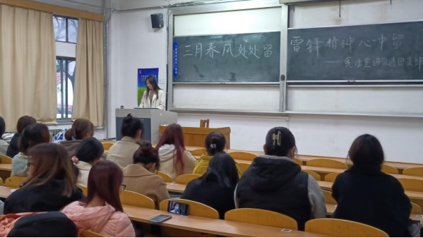 学院“学思享”大学生宪法宣讲团成员走进各年级团支部,以“弘扬雷锋精神,践行法治初心”为主题作了生动演讲,既带领大家集体学习习近平总书记关于深入开展学雷锋活动作出的重要指示精神,又为大家阐述习近平法治思想的深刻内涵。