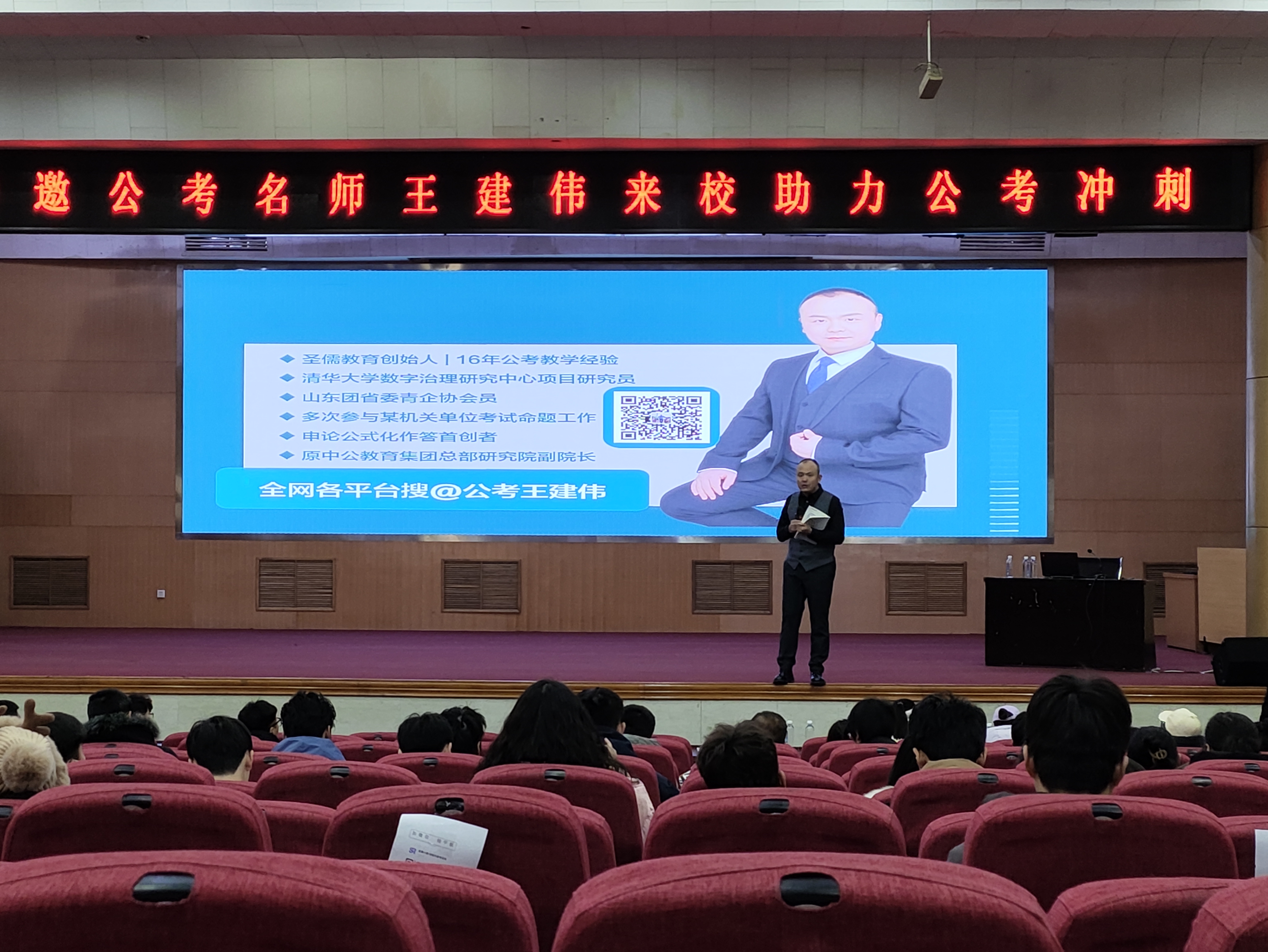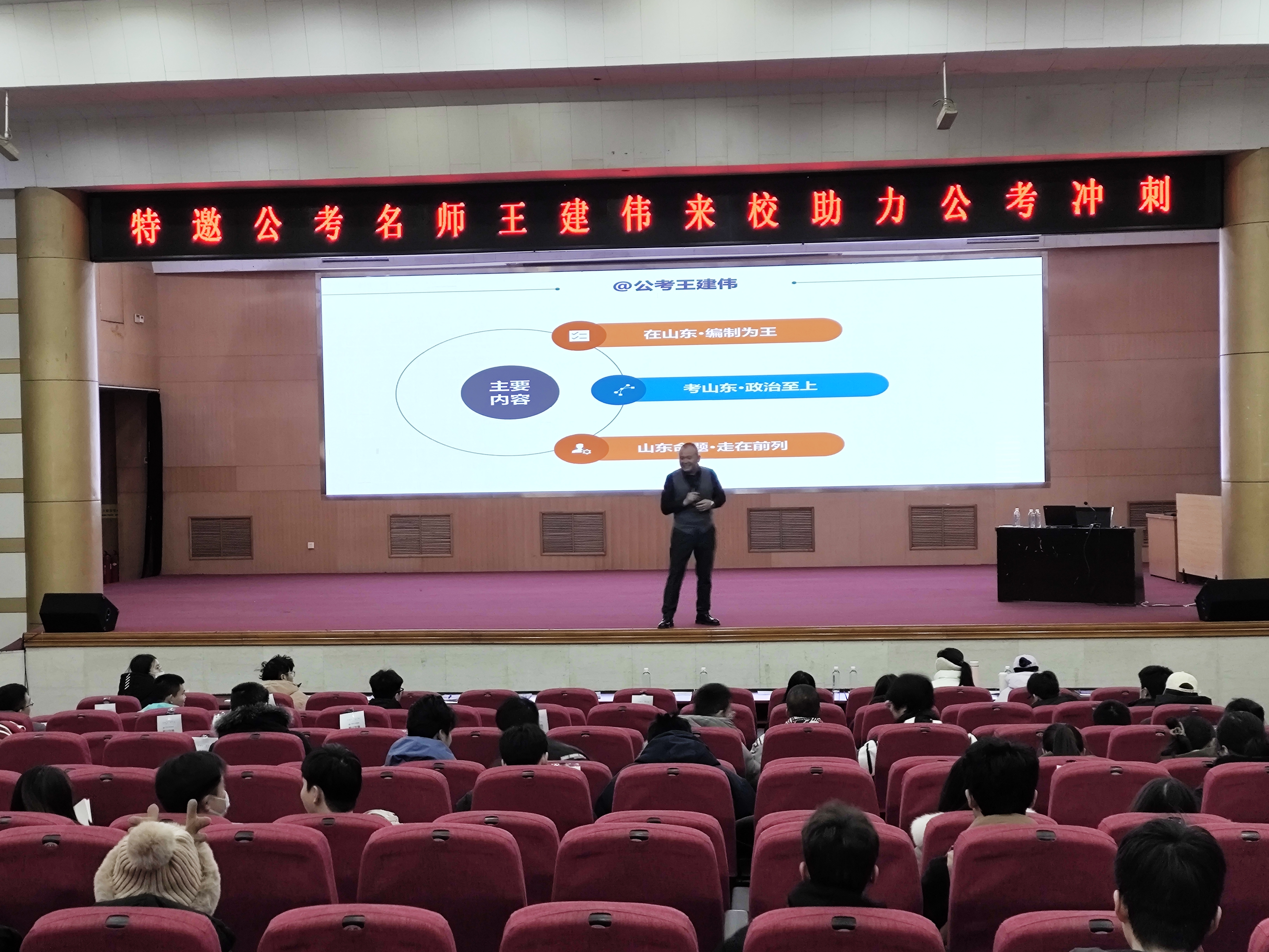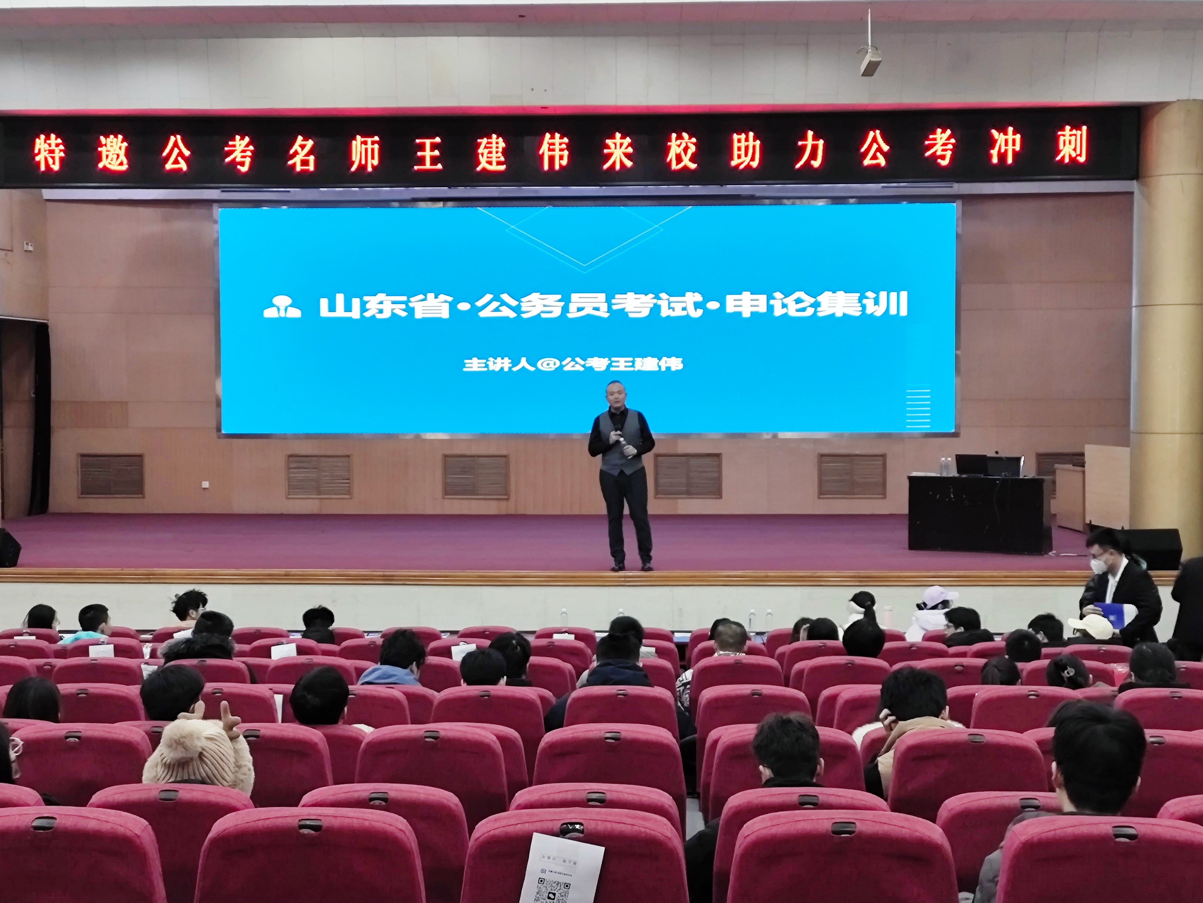 王建伟围绕“在山东·编制为王”、“考山东·政治至上”、“山东命题·走在前列”三个板块对公考展开了详细介绍。首先,他结合当前山东省的公考形势,就编制类型、考试机会、公考科目、考试大纲等方面向同学们展开介绍。随后,重点讲解了申论重要考点和申论作文,传授给同学们申论考场答题技巧。讲座中,王建伟建议备考学生在准备申论时开拓思维,注意知识的积累和题目技巧的把握,掌握申论提分密码。