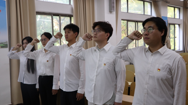 新发展党员们佩戴着象征身份与使命的党徽,神情肃穆、右手握拳,面向鲜红党旗庄严宣誓:“我志愿加入中国共产党,拥护党的纲领,遵守党的章程,履行党员义务,执行党的决定,严守党的纪律,保守党的秘密,对党忠诚,积极工作,为共产主义奋斗终身,随时准备为党和人民牺牲一切,永不叛。”铿锵有力的誓言在会议室久久回荡,彰显着新发展党员对党的无限忠诚与为共产主义事业奋斗终身的坚定决心。