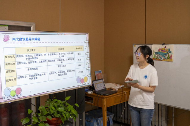 (图为高子雯在课堂上引导孩子们对比南北建筑的差异)