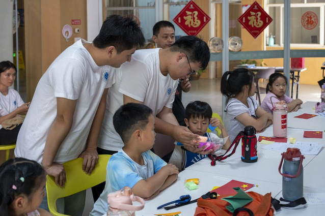 (图为实践团成员在趣味体验环节中指导孩子们使用彩泥)