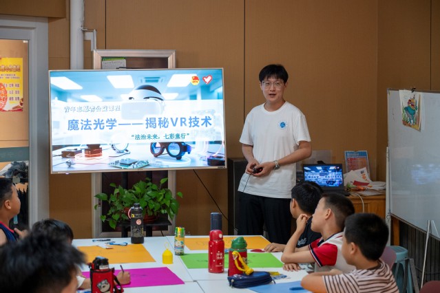 实践团成员曹艺宝通过PPT讲解与趣味问答的形式向学生们介绍VR技术的定义、工作原理及实际应用场景,帮助学生们建立对VR技术的初步认知。随后,学生们分组领取材料包,在实践团成员的指导下动手制作简易VR眼镜。