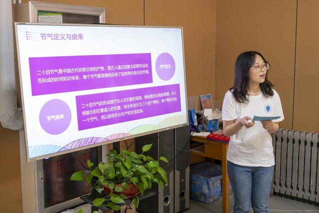 第二阶段,高子雯对二十四节气的定义、由来及与农耕文化的关系进行讲解。并通过介绍现代社会对节气文化的传承与创新,呼吁学生们保护和传承传统文化。讲解后,学生们通过“二十四节气版翻翻乐桌游”进行趣味互动,进一步巩固了对节气知识的掌握。
