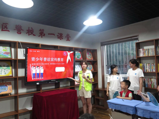 (图为实践团成员在义警联盟驿站开展普法宣传教育活动)