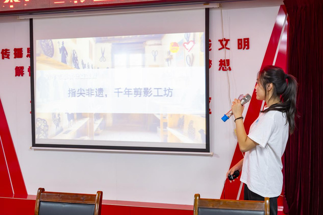 在“指尖非遗”环节,实践团成员孙语以唐诗引入,向学生们介绍非物质文化遗产的定义,并展示风筝、昆曲、制茶等部分非遗项目的图片。孙语重点讲解了剪纸艺术的分类特点和制作方法。讲解结束后,志愿者向在场学生分发剪纸工具和材料。学生们在志愿者的指导下,对照着参考图案,使用剪刀和彩纸完成简易的剪纸作品。