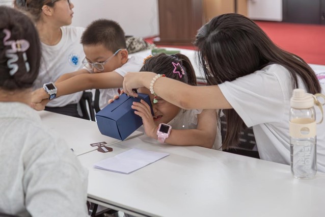 (图为实践团成员协助学生进行“舒尔特方格”游戏)