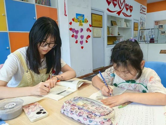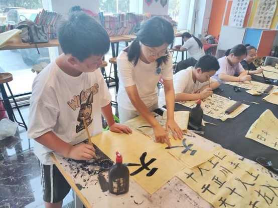 (图为实践团成员在益齐公益书法课堂与学生一起练习书法)