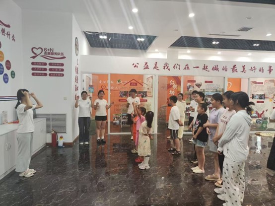 (图为实践团成员们在益齐公益书法课间带领学生们学习手势舞)
