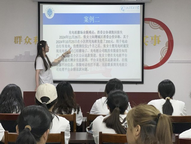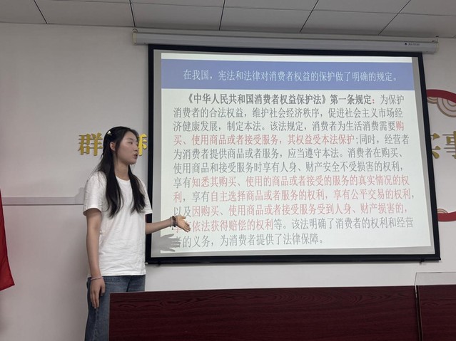 实践团成员兰瑾妤以“315”消费者权益保护日为切入点,从历史由来、法律渊源、相关案例及实践方法四个方面,对《消费者权益保护法》进行了详细解读,并结合生动的维权案例,向居民科普了维权的法律途径。