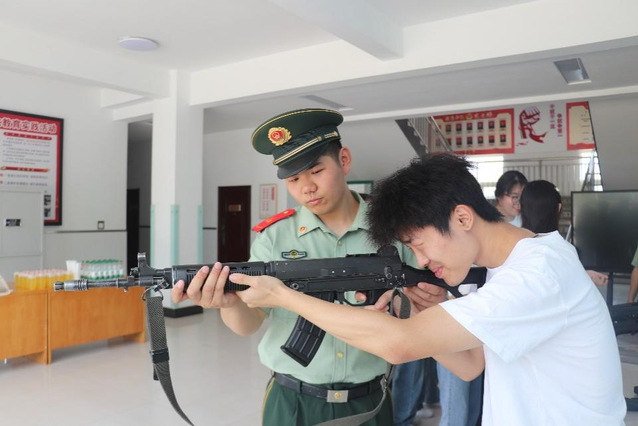 (图为武警官兵指导实践团成员持枪动作)