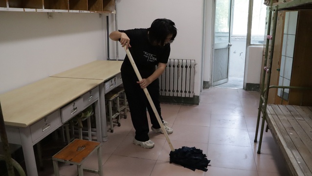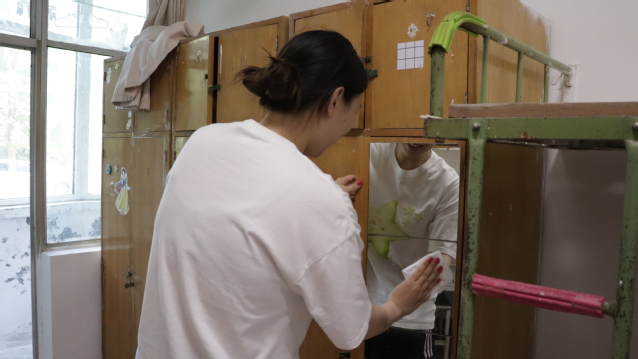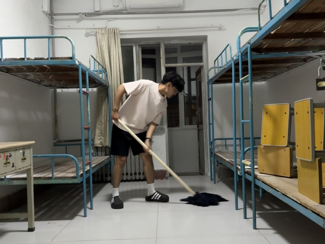 劳动现场,党员同志们分工明确,干劲十足,仔细擦拭门窗、桌椅、床架,认真清扫地面,拖洗地板。天气炎热,汗水逐渐浸湿衣衫,大家以实际行动践行着服务奉献精神,努力为新生们打造一个窗明几净、焕然一新的“家”。
