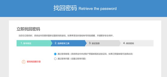 ②按照四个步骤分别输入信息、验证邮箱或密保问题即可修改密码。