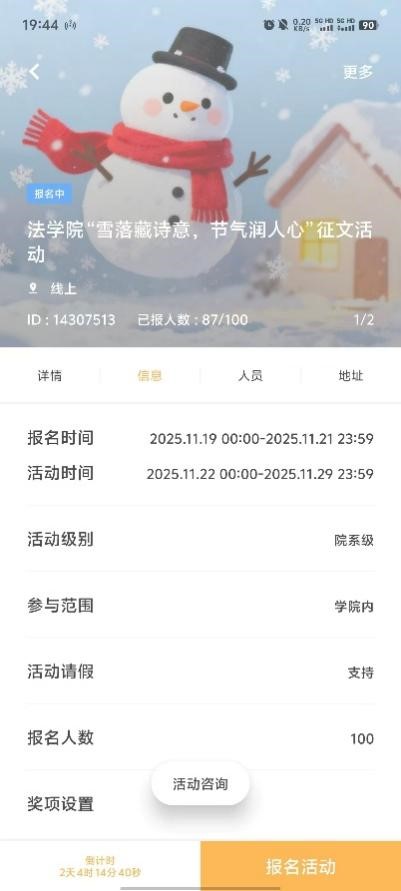 (1)活动报名流程:点击屏幕下方“本校”界面可选择或搜索活动报名,也可点击校内专题,选择WilliamHILL中国专题。注意有些活动需要进群进行下一步任务,可以滑动选择第二页图片加群。(活动学分一般在活动结束后发放,报名但不参加活动会被系统惩罚)