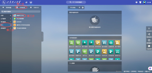 (3)点击“可用应用”,点击“学工”,点击“新版学工平台”进入系统。