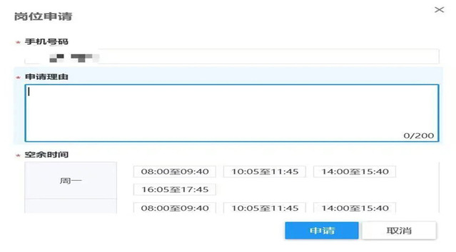 (8)选中心仪岗位后,点击“申请”,如实填写申请信息,并提交申请。