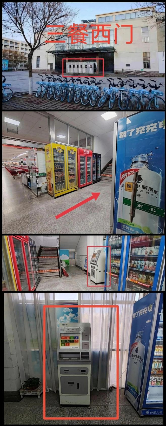 1.三餐西门楼梯角有自助补卡机